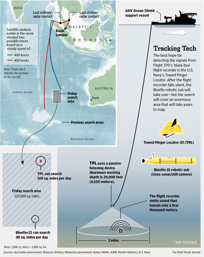 On Friday, April 4th, a total of 14 aircraft and nine ships began an intense search in what seems to be the most plausible crash site - a 217,000 square kilometers stretch of the remote Indian Ocean northwest of Perth. Among them is Australian naval supply ship Ocean Shield, which is carrying with it, TPL - 25, a giant underwater microphone that is trying to detect the 'ping' that the locator beacons of the flight recorders are designed to emit, following an airplane crash. If it is able to locate the black box, the crew will deploy US built robot - Bluefin-21.